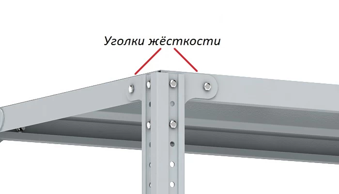 - Уголки крепятся на верхнюю и нижнюю полку стеллажа, обеспечивая жёсткость конструкции (на одну полку нужно 8 уголков). У стеллажей высотой от 1500 мм уголки на две полки входят в комплект. Если вам требуется дополнительно усилить другие полки – уголки для них надо заказывать отдельно.