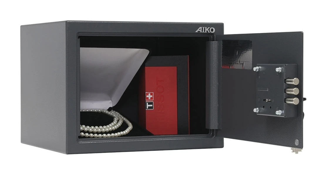 Компактный лёгкий сейф, рассчитанный на хранение документации, печатей, некрупных сумм денег, травматического оружия и прочих вещей, доступ к которым требуется ограничить. Благодаря невысокой стоимости этот сейф является весьма популярным среди клиентов, желающих установить его в квартире или офисе с охраной, куда сложно попасть постороннему. Однако уровень его защиты невысок, и держать в нём по-настоящему солидные ценности не следует.Модель Aiko T-230 KL представляет собою прочное сварное изделие из стальных листов толщиной 1.2 мм; дверь усилена за счёт лицевой панели в 2.8 мм. Запирается трёхригельным ключевым замком «Border», к которому прилагаются два ключа.